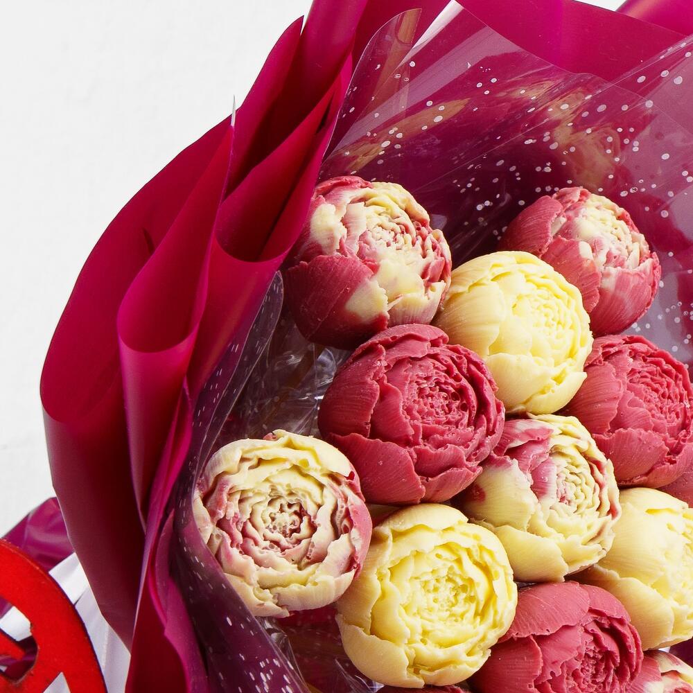 Атласная лента – 1 шт.Прозрачная пленка – 1 шт.авторская пленка – 1 шт.шоколадные пионы из бельгийского шоколада – 13 шт.